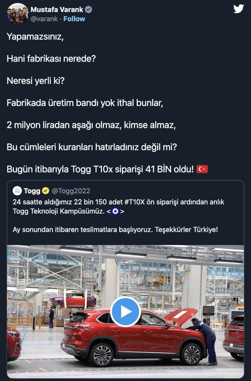 Türkiye'nin otomobiliyle ilgili muhalif kesimler tarafından yapılan dezenformasyona vurgu yapan Sanayi ve Teknoloji Bakanı Mustafa Varank, Twitter hesabından gönderme yaptı.