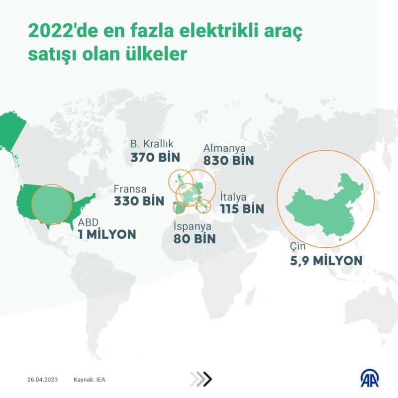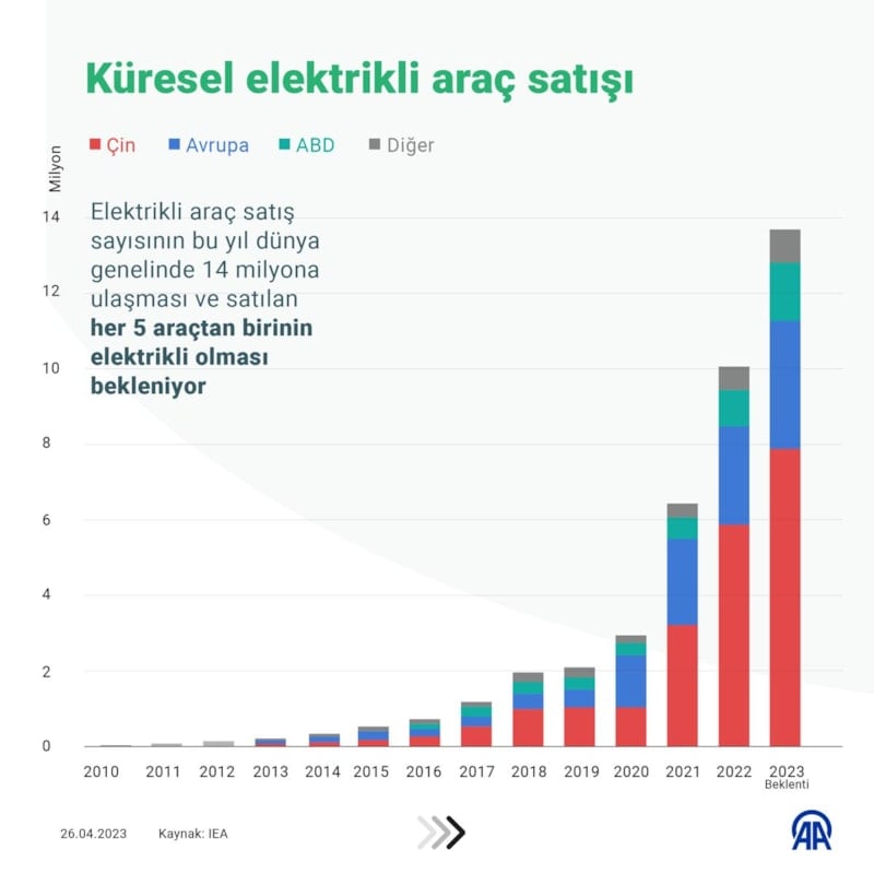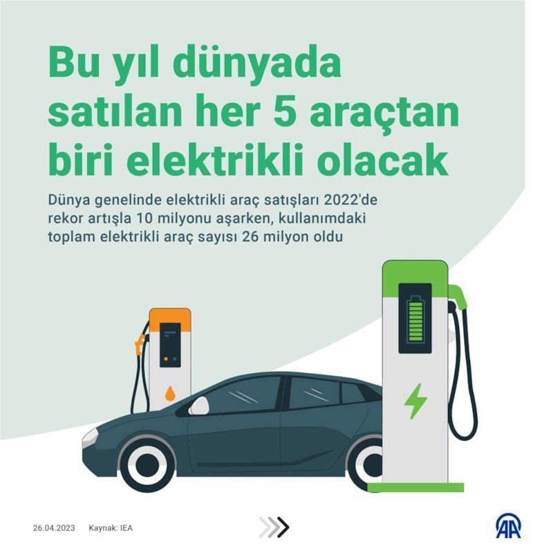 Elektrikli araç satışı 2022'de 2021'e göre yüzde 55 arttı ve rekor kırarak 10 milyonu aştı. 2023'te ise elektrikli araç satışının 14 milyona ulaşması ve satılan her 5 araçtan birinin elektrikli olması bekleniyor.