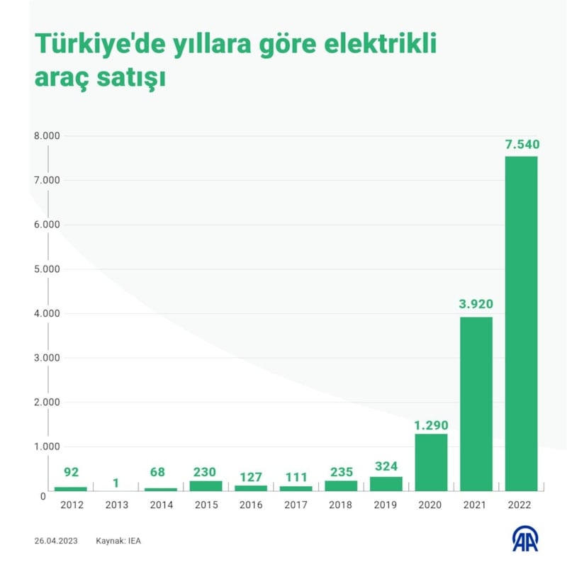Türkiye'de geçen yıl toplam elektrikli araç satışları 2021'e göre yaklaşık iki katına çıkarak 7 bin 540 oldu, bu rakam 2021'de 3 bin 920 olmuştu.