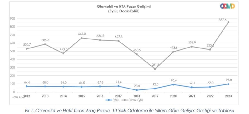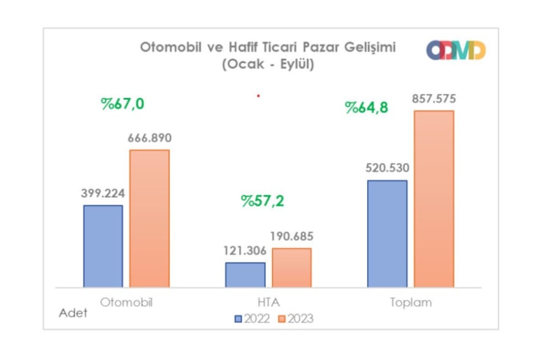 Türkiye otomobil ve hafif ticari araç toplam satışları,- 2023 yılı Ocak-Eylül döneminde, bir önceki yılın aynı dönemine göre yüzde 64,8 artarak 857 bin 575 adet olarak gerçekleşti.