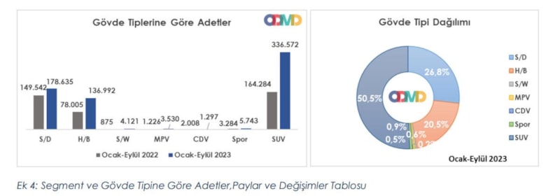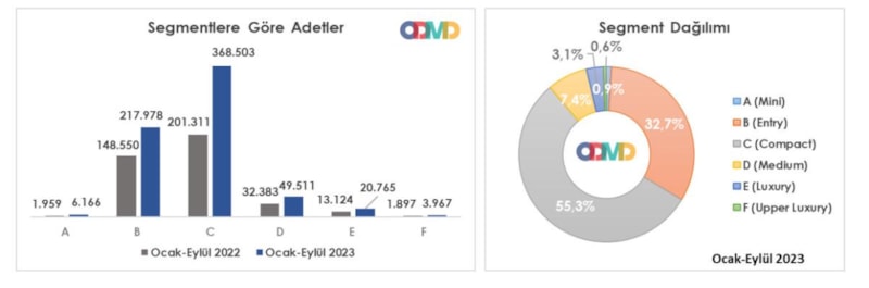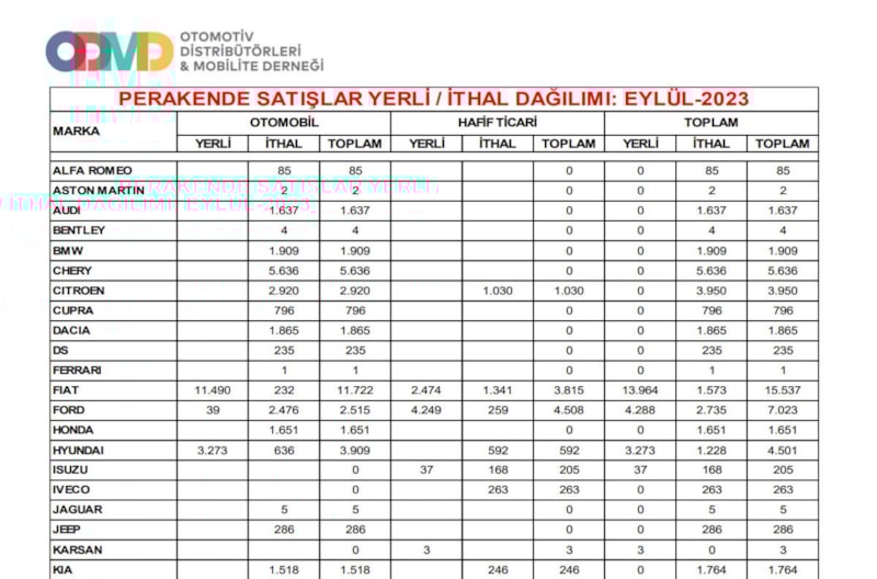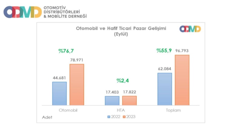 Otomotiv Distribütörleri ve Mobilite Derneği (ODMD) eylül ayı verilerine göre, Türkiye otomobil ve hafif ticari araç toplam satışları, 2022 yılı Eylül ayına göre yüzde 55,9 artarak 96 bin 793 seviyesinde gerçekleşti.