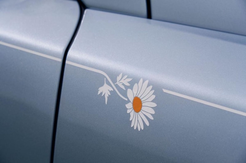 Otomobilin Toz Mavisi (Powder Blue) dış gövde rengi üzerinde uzanan tek ve özel Coachline (yan şerit), özenle elle boyanmış bir papatya motifiyle tamamlanıyor.