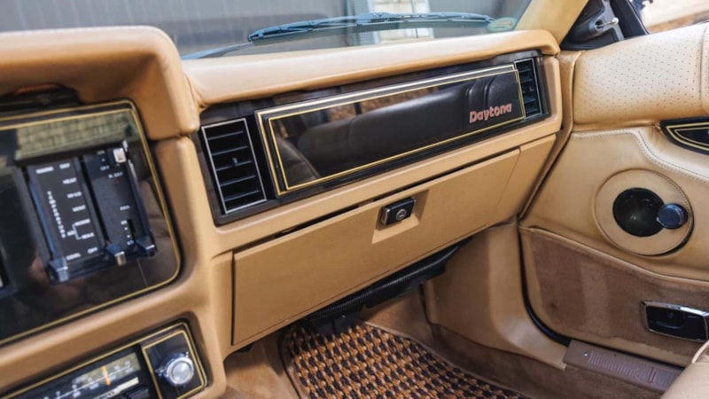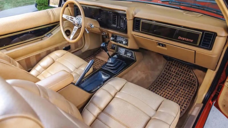 Aracın iç mekanı tamamen krem rengiyle donatılmış durumda. Deri yarış koltukları (kova tipi), deri dikişli direksiyon simidi, dönemin radyosu ve yolcu tarafındaki ön panele damgalanmış Daytona logosu iç mekandaki detaylar arasında yer alıyor.