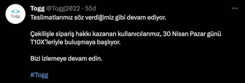 Teslimatların söz verildiği gibi devam ettiği belirtilen açıklamada, "Çekilişle sipariş hakkı kazanan kullanıcılarımız 30 Nisan Pazar günü T10X'leriyle buluşmaya başlıyor. Bizi izlemeye devam edin" denildi.