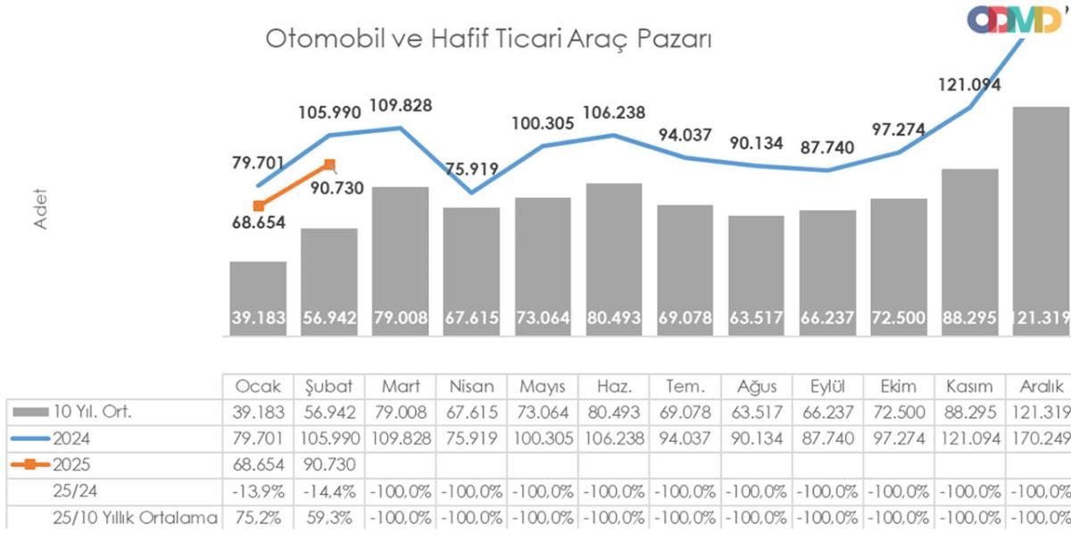 Otomotiv Distribütörleri ve Mobilite Derneği (ODMD) tarafından açıklanan rapora göre, otomobil ve hafif ticari araç pazarı 2024 yılı Şubat ayına göre yüzde 14,4 azalarak 90 bin 730 adet oldu.