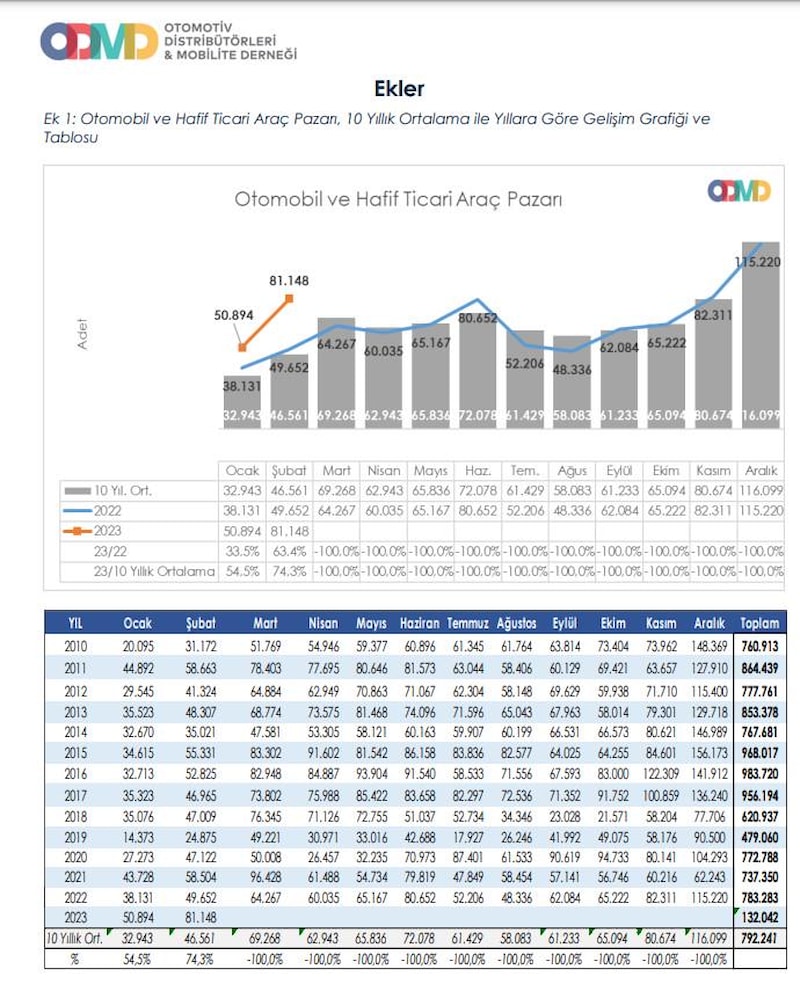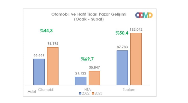 Türkiye otomobil ve hafif ticari araç toplam satışları, 2023 yılı Ocak-Şubat döneminde ise bir önceki yılın aynı dönemine göre yüzde 50,4 artarak 132 bin 42 olarak gerçekleşti.