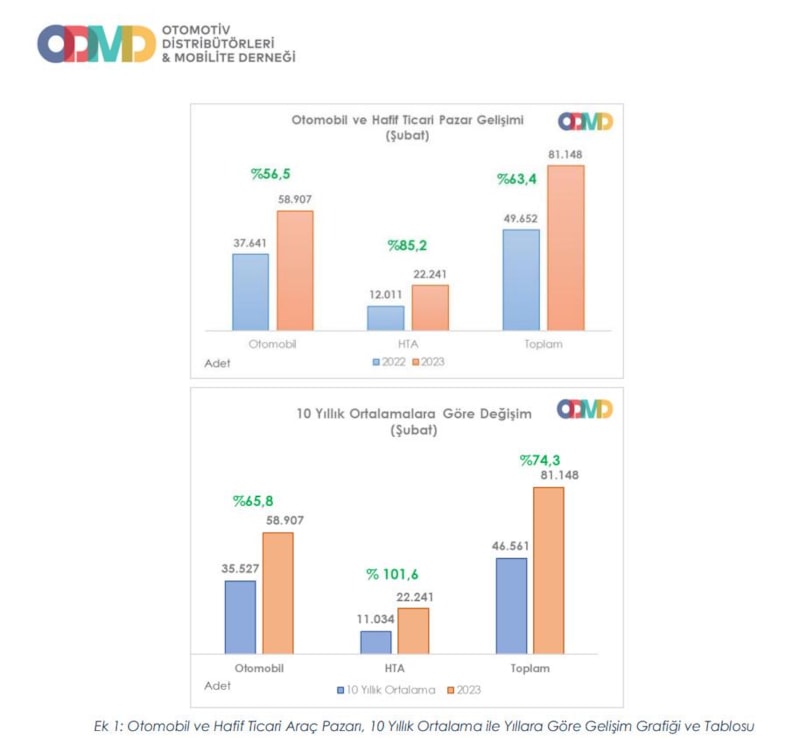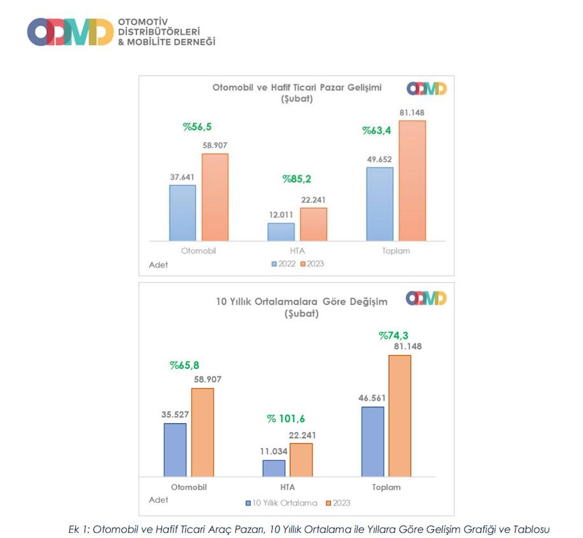 Otomobil ve hafif ticari araç pazarı, 2022 yılı şubat ayına göre yüzde 63,4 büyüyerek 81 bin 148 adet olurken, bu tüm zamanların en yüksek şubat ayı olarak kayıtlara geçti.