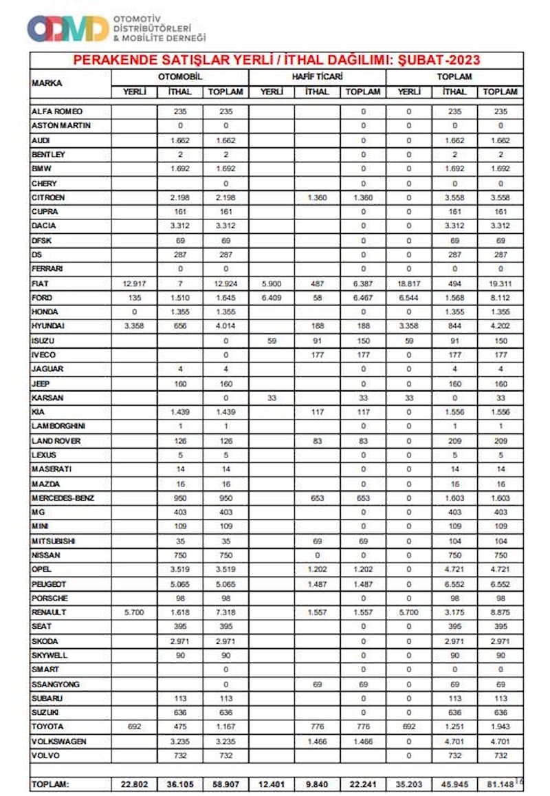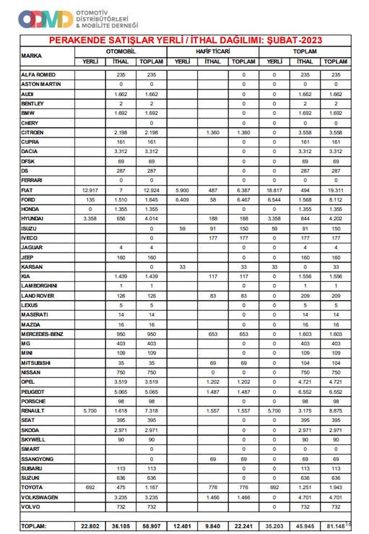 ODMD, şubat ayına ilişkin sıfır otomobil ve hafif ticari araç satışı istatistiklerini paylaştı.