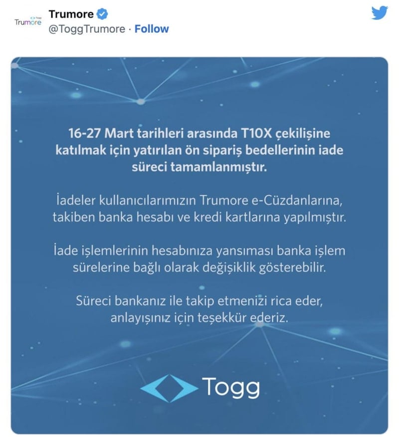 16-27 Mart tarihleri arasında T10X çekilişine katılmak için yatırılan ön sipariş bedellerinin iade süreci tamamlanmıştır. İadeler kullanıcılarımızın Trumore e-Cüzdanlarına, takiben banka hesabı ve kredi kartlarına yapılmıştır. İade işlemlerinin hesabınıza yansıması banka işlem sürelerine bağlı olarak değişiklik gösterebilir. Süreci bankanız ile takip etmenizi rica eder, anlayışınız için teşekkür ederiz.