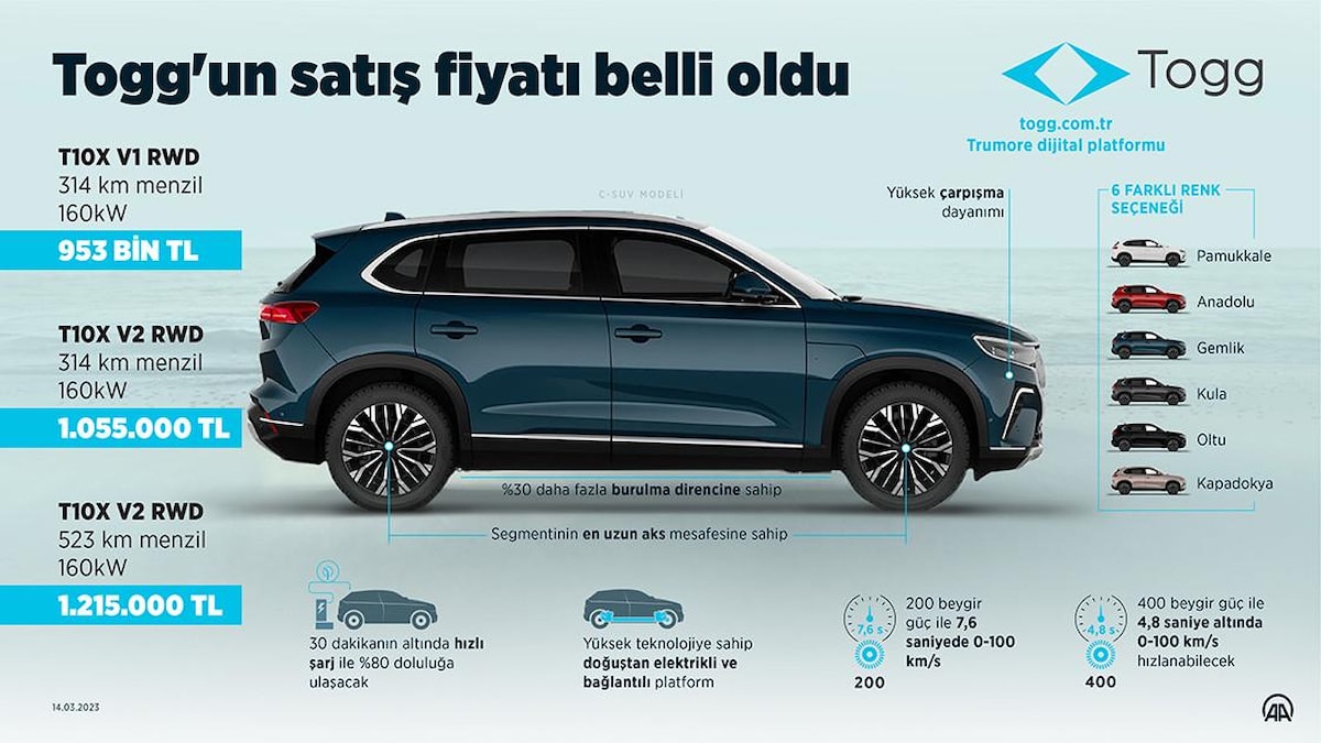 16-27 Mart'ta Trumore dijital platformu ve Togg web sitesi üzerinden ön siparişleri alınacak olan Togg T10X, 953 bin TL'den başlayan fiyatlarla satışa sunulmuştu.