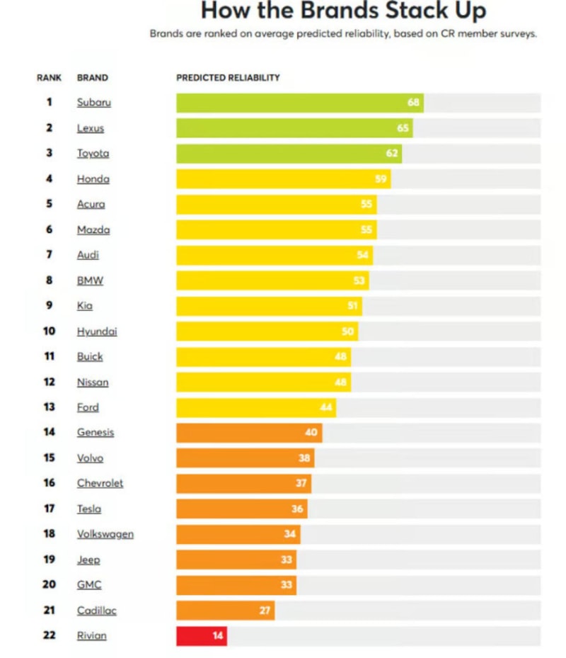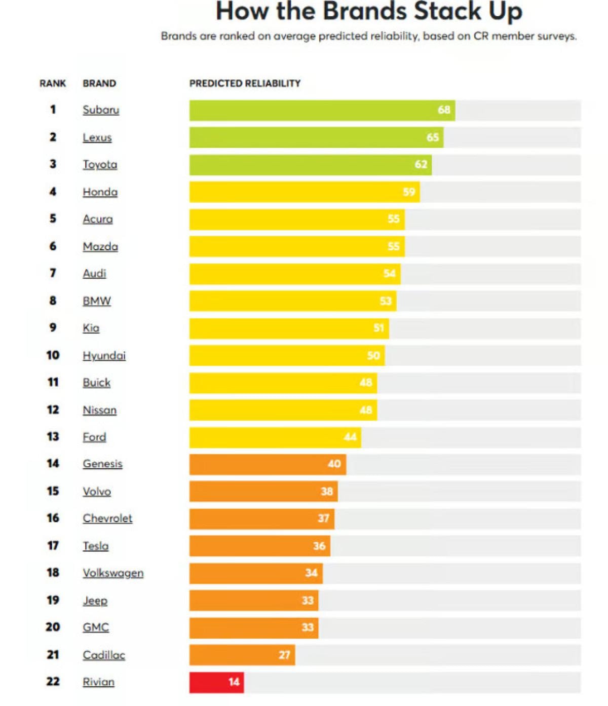 Subaru, güvenilirlik raporunun yanı sıra yıllık genel marka sıralamasında da zirveye yerleşti. BMW, Porsche ve Honda gibi markaları geride bırakan Subaru, güvenilirlik ve kalite konusunda liderliğini ortaya koydu.