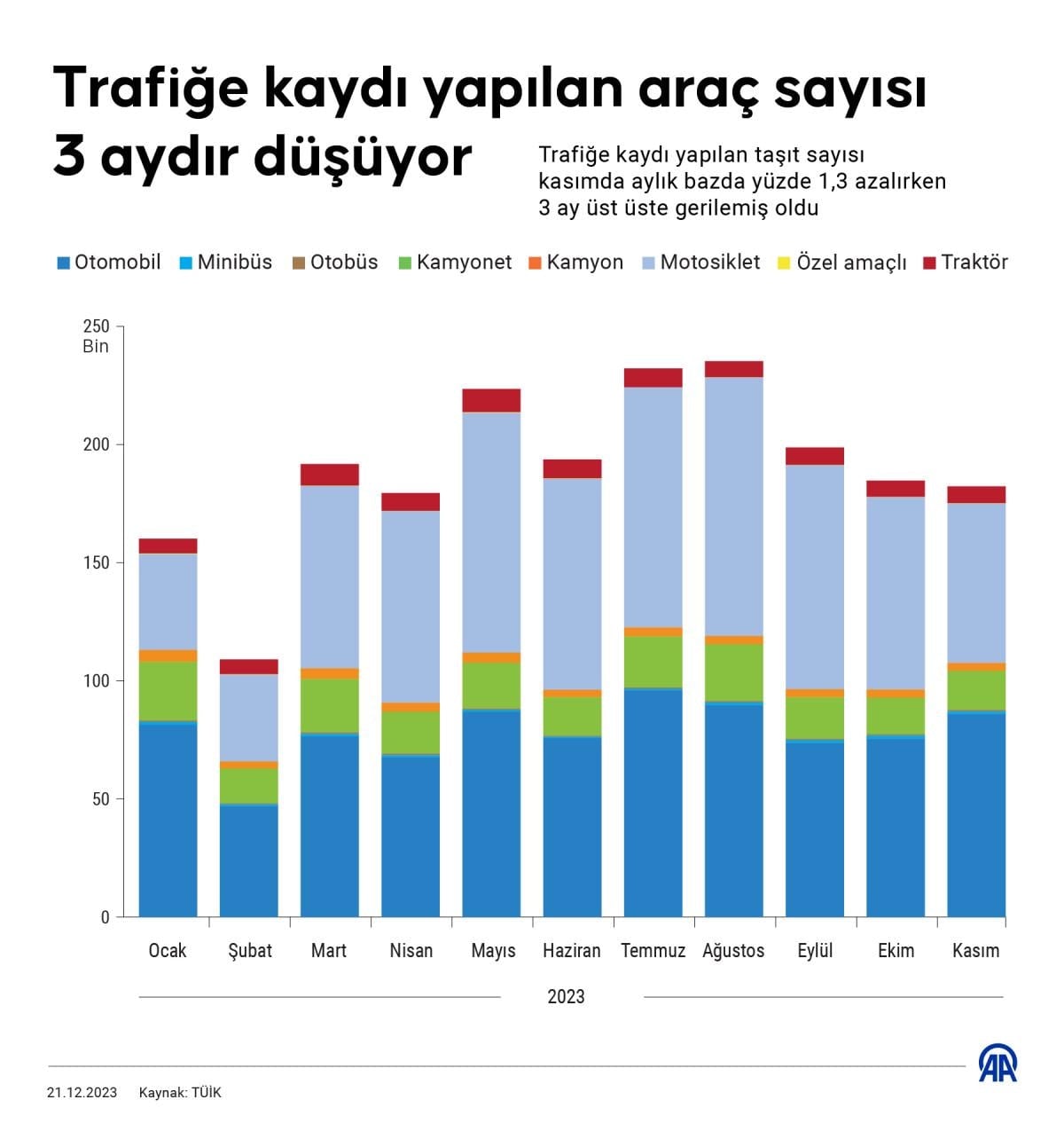 Trafiğe kaydı yapılan taşıt sayısı kasımda aylık bazda yüzde 1,3 azaldı. Ekimde trafiğe kaydı yapılan taşıt sayısı 184 bin 767 iken kasımda 182 bin 301'e geriledi.
