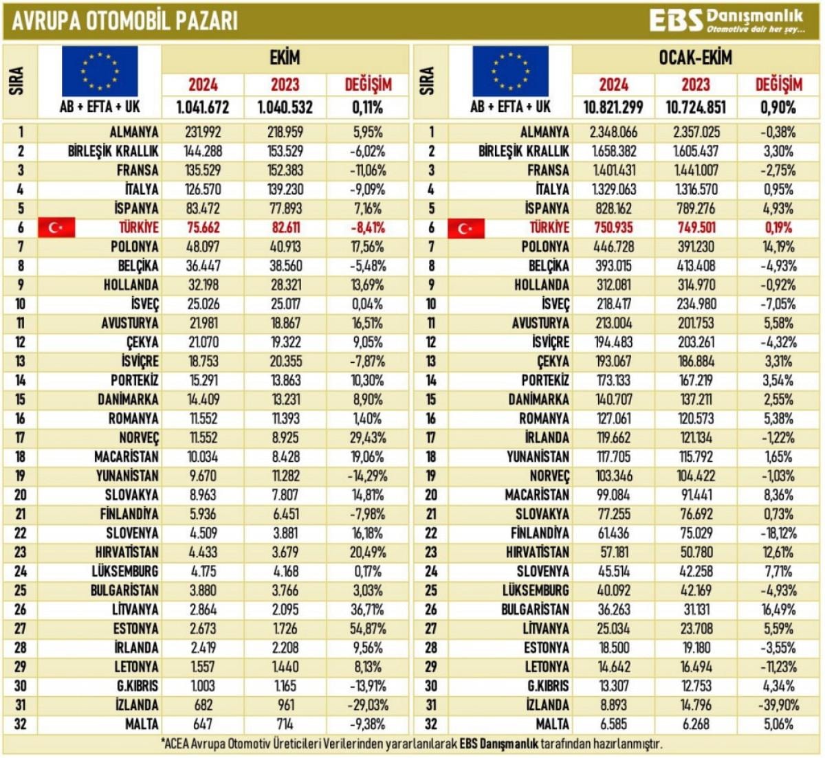EBS Danışmanlık tarafından derlenen verileri paylaşan otomobil gazetecisi Emre Özpeynirci'ye göre, yılın ilk 10 ayında 750 bin otomobil satılan Türkiye, toplam otomobil satışında Avrupa'da 6. sırada yer alıyor.