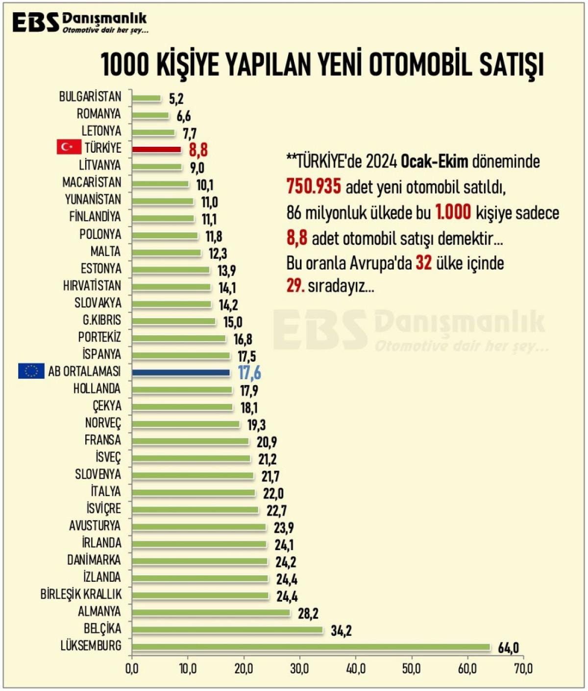 Türkiye, kişi başına otomobil satışı sıralamasında 32 ülke arasında 29. sırada yer alıyor. Bizim altımızda kalan ülkelerse sırasıyla Letonya, Romanya ve Bulgaristan.