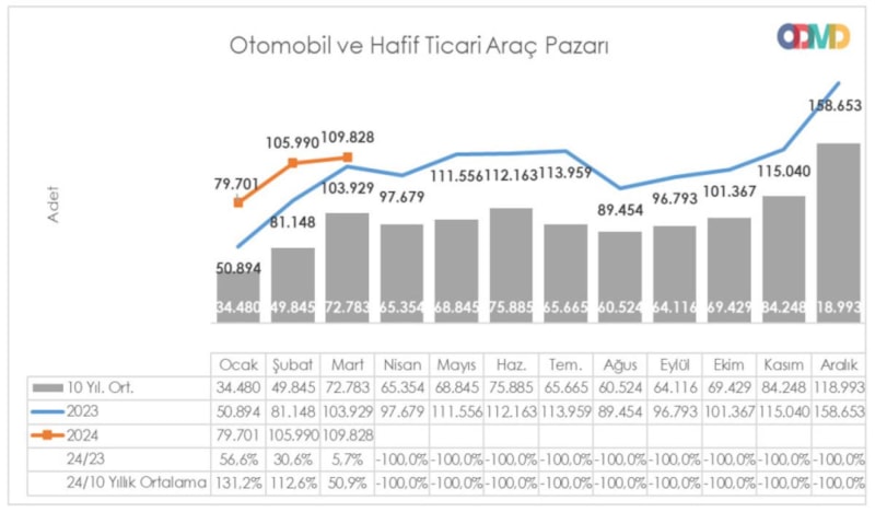 Mart aylarının 10 yıllık ortalaması 72 bin 783 adet düzeyindeydi. Mart 2024'teki satışlar 10 yıllık ortalamanın da yüzde 51 üzerine çıktı.
