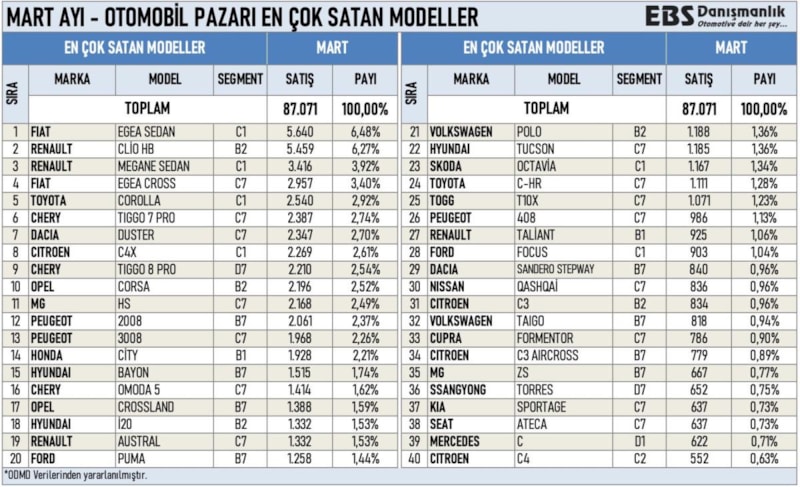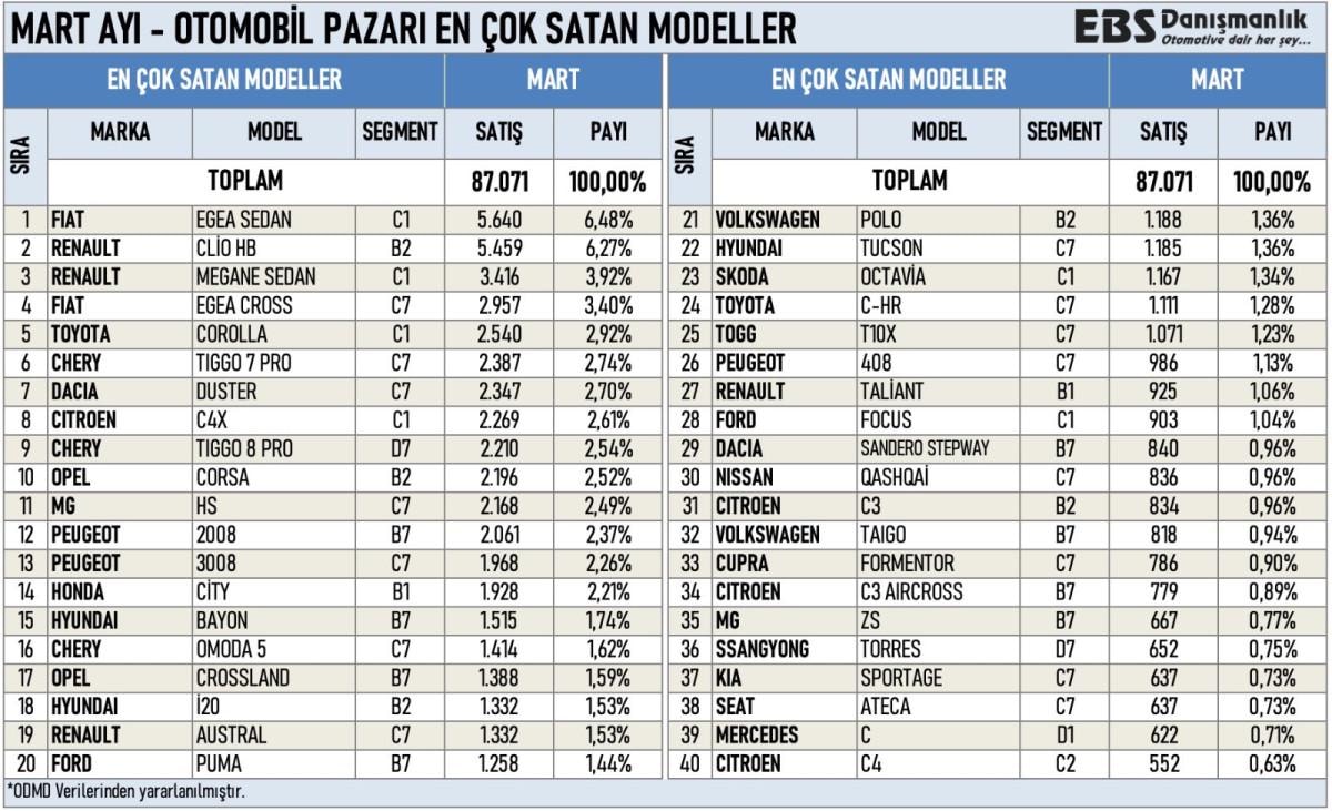 Tüm zamanların en iyi mart satışında sırasıyla Fiat Egea Sedan (5 bin 640) Renault Clio (5 bin 459) ve Renault Megane Sedan (3 bin 416) zirvede yer aldı. En çok satan 10 model şu şekilde: