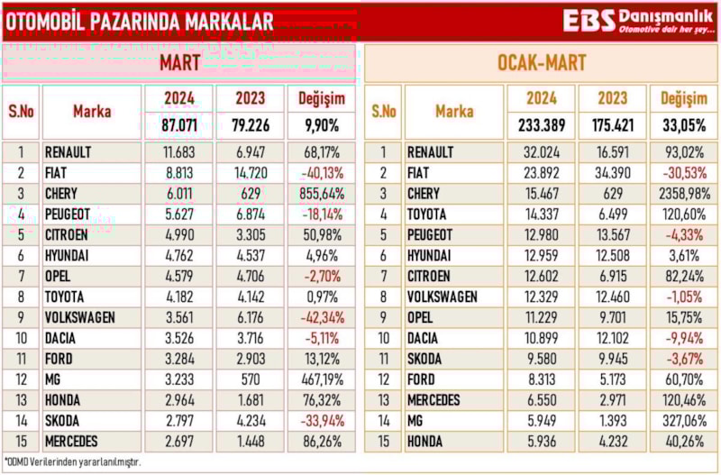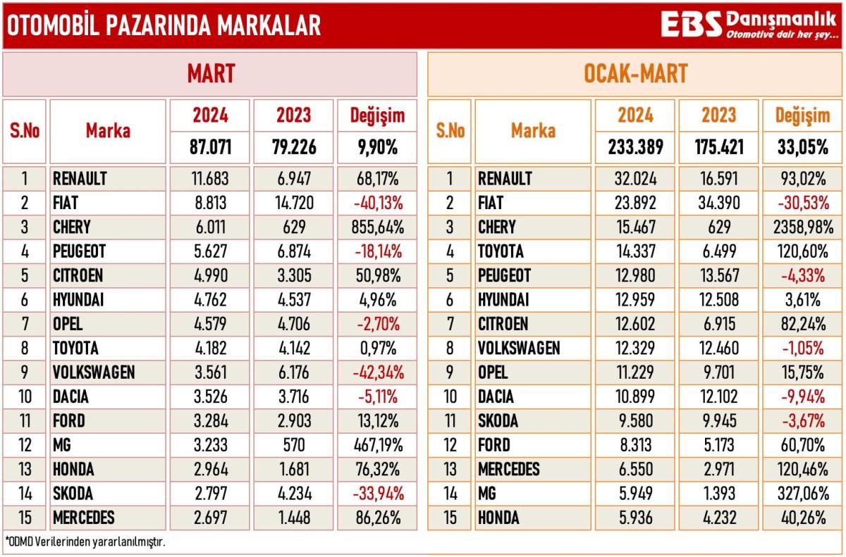 Mart ayında en çok satan otomobil markası 11 bin 683 adetle Renault olurken, onu 8 bin 813 adet ile Fiat ve 6 bin 011 adet ile Chery izledi.