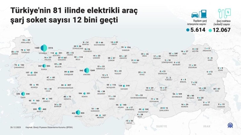 Enerji Piyasası Düzenleme Kurumu'ndan (EPDK) alınan bilgilere göre Türkiye'nin 81 ilindeki 5 bin 614 istasyonda elektrikli araç kullanıcılarına 8 bin 492 yavaş şarj (AC) ve 3 bin 575 hızlı şarj (DC) hizmeti veriliyor.