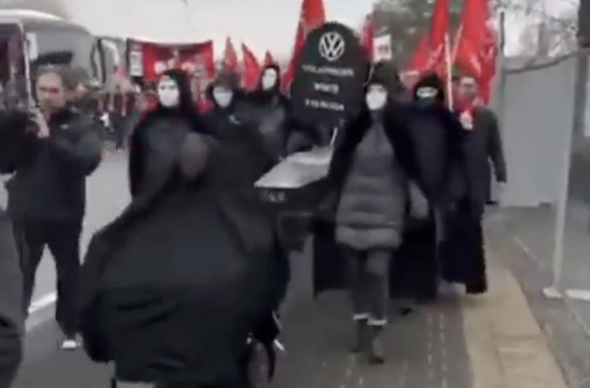 Ellerinde "Gelecek, değil tasfiye" ve "Tüm fabrikalar açık kalmalı" yazılı pankartlar taşıyan işçilerin ellerinde tabut ve giydikleri siyah elbiselerle birlikte Volkswagen için cenaze töreni düzenlemesi Alman basınında geniş yer bulmuştu.