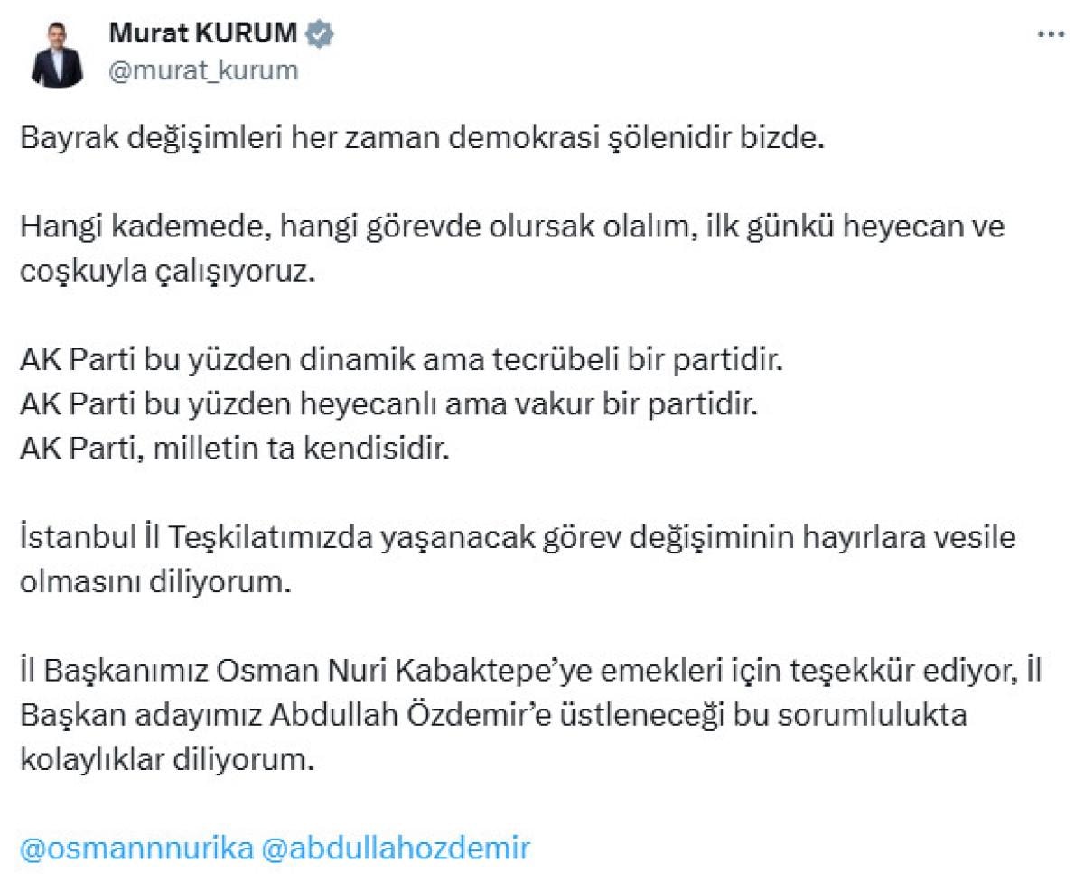 AK Parti İstanbul'da yaşanacak görev değişiminin hayırlı olmasını dileyen Bakan Kurum, şu ifadeleri kullandı:
