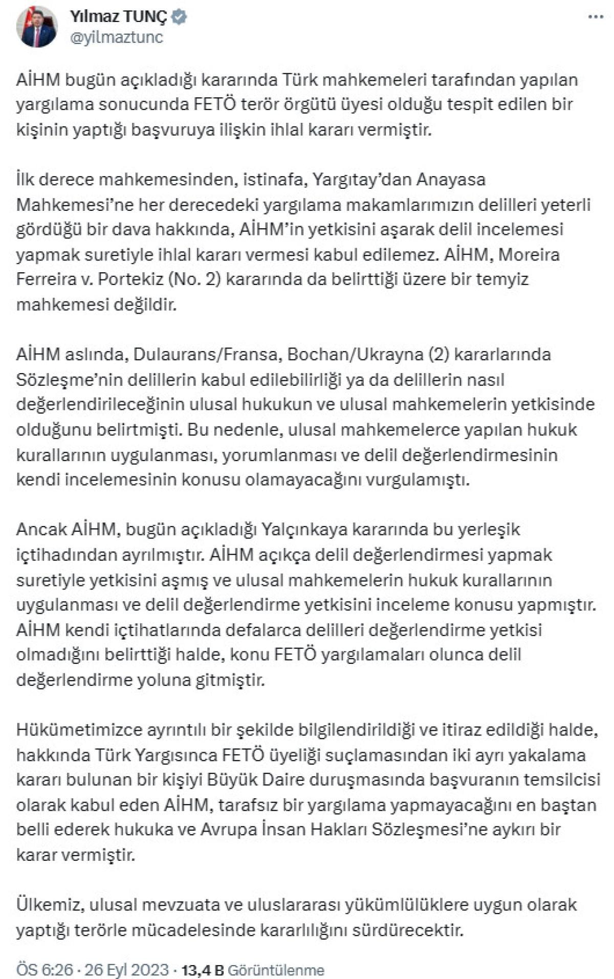 Kararının kabul edilemez olduğunun altını çizen Bakan Tunç, "Ülkemiz, ulusal mevzuata ve uluslararası yükümlülüklere uygun olarak yaptığı terörle mücadelesinde kararlılığını sürdürecektir" dedi.
