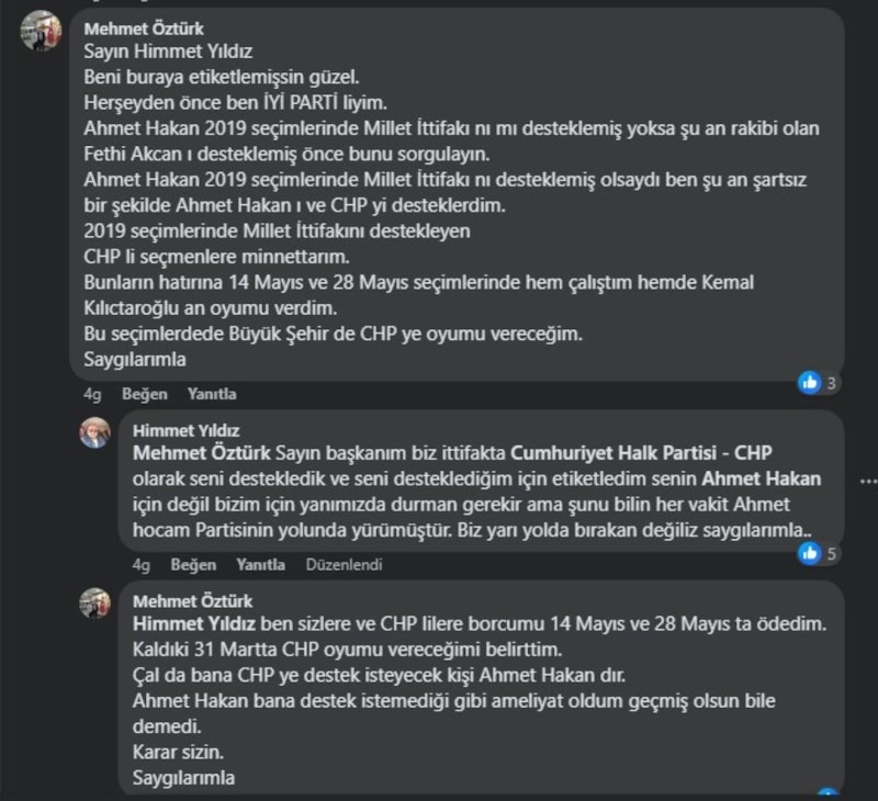 Paylaşımı yapan CHP’li Himmet Yıldız, İyi Partili Öztürk’ün yorumunun altında cevap olarak, “Biz CHP olarak seni destekledik, senin de CHP Adayı için değil, bizim için yanımızda durman gerekiyor. Bizi yarı yolda bırakmayın.” ifadelerini yazdı.
