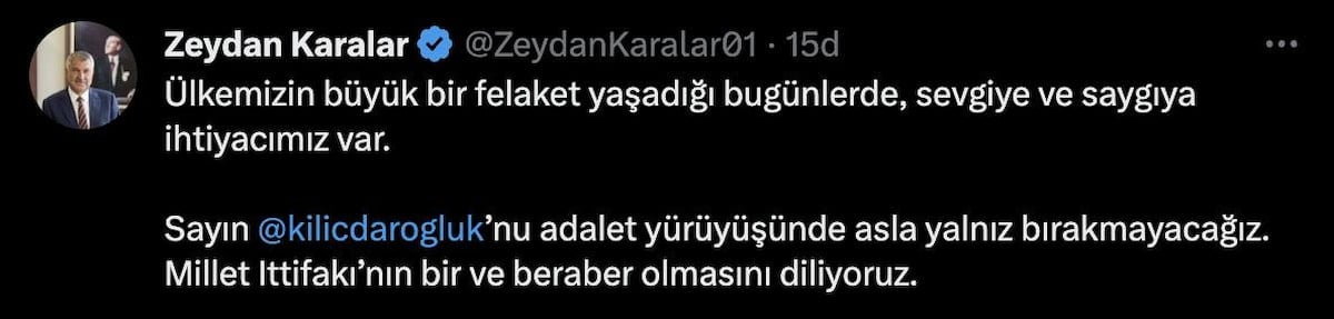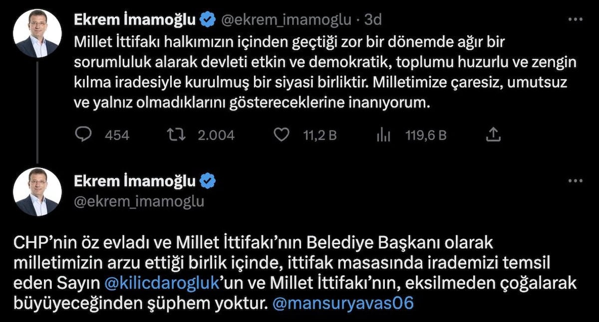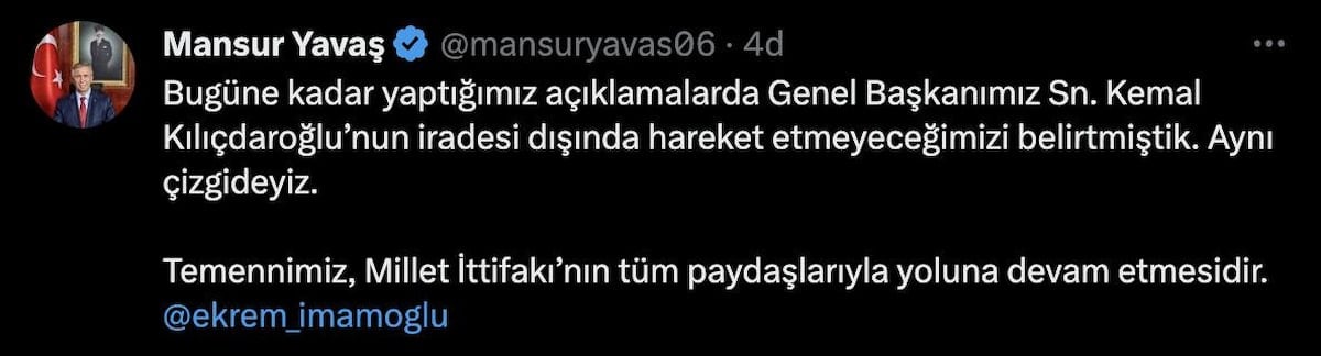 Mansur Yavaş ve Ekrem İmamoğlu, sosyal medyadan Cumhuriyet Halk Partisi (CHP) Genel Başkanı destek mesajı verdi. Yavaş,