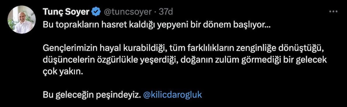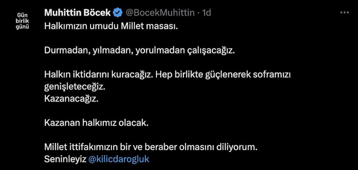 Millet İttifakı halkımızın içinden geçtiği zor bir dönemde ağır bir sorumluluk alarak devleti etkin ve demokratik, toplumu huzurlu ve zengin kılma iradesiyle kurulmuş bir siyasi birliktir. Milletimize çaresiz, umutsuz ve yalnız olmadıklarını göstereceklerine inanıyorum. CHP'nin öz evladı ve Millet İttifakı'nın Belediye Başkanı olarak milletimizin arzu ettiği birlik içinde, ittifak masasında irademizi temsil eden Sayın Kılıçdaroğlu'nun ve Millet İttifakı'nın eksilmeden çoğalarak büyüyeceğinden şüphem yoktur.