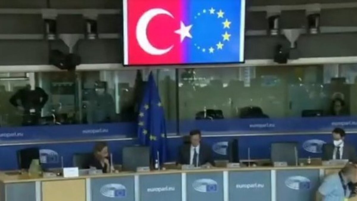Bakan Çavuşoğlu’nun konuşması sırasında Türkiye ve Avrupa Birliği’nin (AB) birlikteliğini temsil eden Türkiye ve AB’nin bayraklarının tek karede gösterildiği logo tartışma konusu oldu. Yeşiller grubunda Alman Milletvekili Reinhard Bütikofer, kullanılan logonun kaldırılmasını istedi.