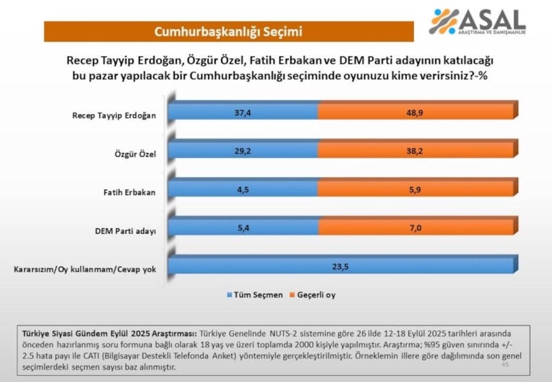 2 bin kişi ile yapılan ankette, seçmene "Recep Tayyip Erdoğan, Özgür Özel, Fatih Erbakan ve DEM Parti adayının katılacağı bu pazar yapılacak bir Cumhurbaşkanlığı seçiminde oyunuzu kime verirsiniz?" sorusu yöneltildi.