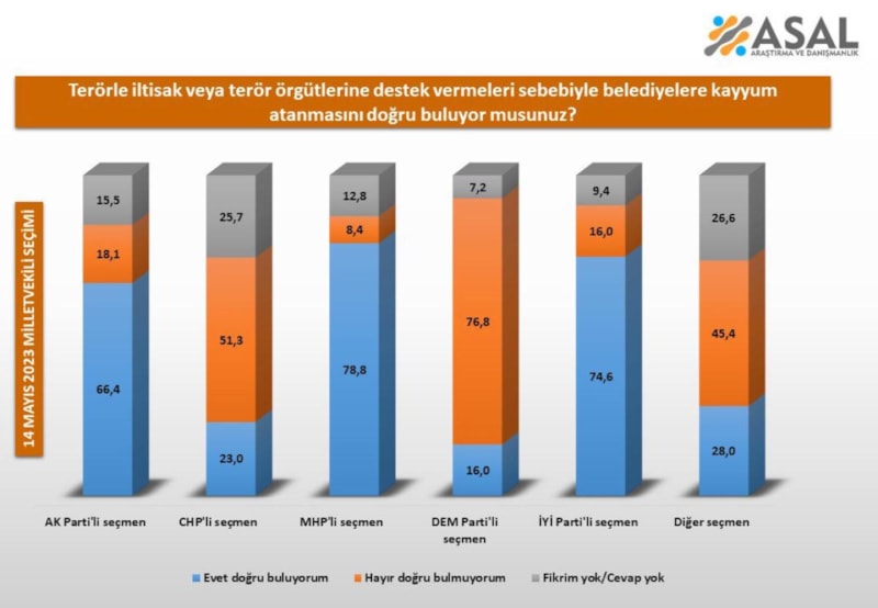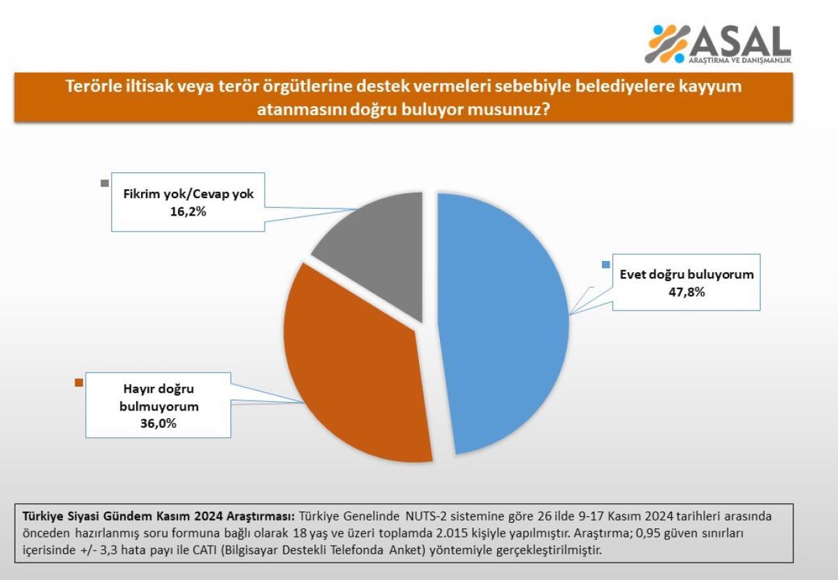 ASAL Araştırma konuyu katılımcılarına "Terör iltisakı sebebiyle Belediyelere kayyum atanmasını doğru buluyor musunuz?" şeklinde sordu.