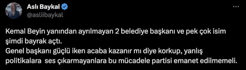Paylaşımında İmamoğlu ve Ankara Büyükşehir Belediye Başkanı Yavaş'a parti emanet edilmemesi gerektiğinin altını çizen Baykal, "Kemal Bey'in yanından ayrılmayan iki belediye başkanı ve pek çok isim şimdi bayrak açtı. Genel başkanı güçlü iken acaba kazanır mı diye korkup yanlış politikalara ses çıkarmayanlara bu mücadele partisi emanet edilmemeli" ifadelerini kullandı.