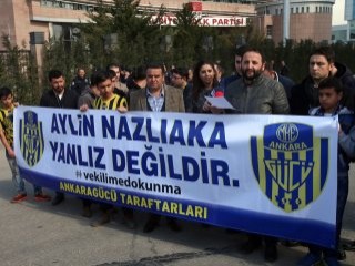 CHP Genel Merkezi önünde toplanan Ankaragücü taraftarı bir grup, partiden ihracı istenen Aylin Nazlıaka'ya destek pankartı açtı.