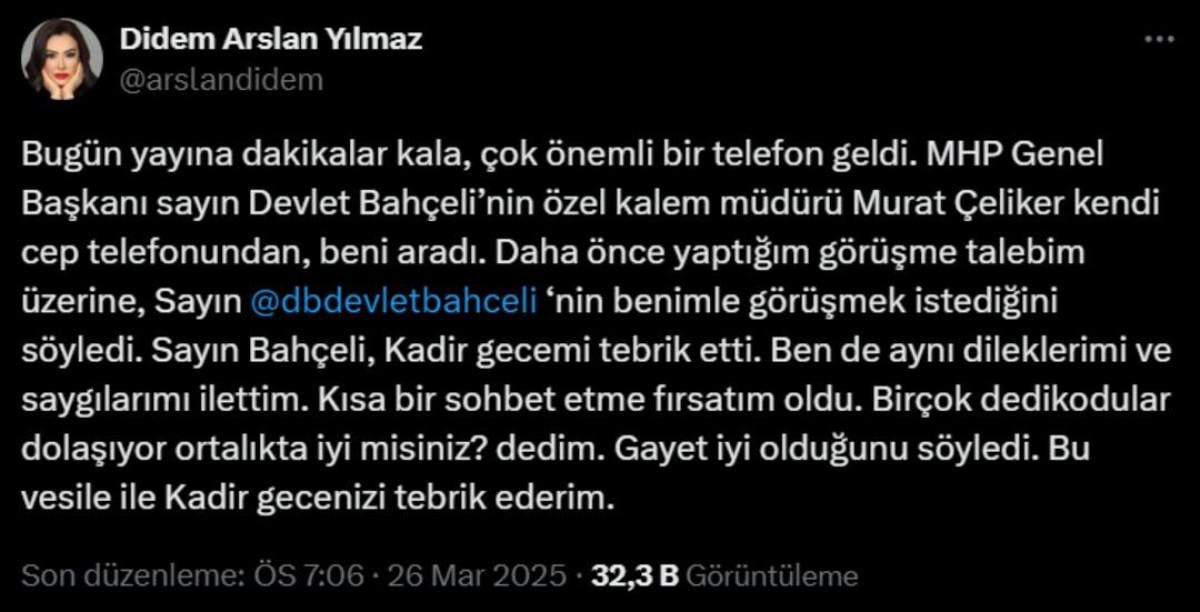 Bugün yayına dakikalar kala, çok önemli bir telefon geldi. MHP Genel Başkanı sayın Devlet Bahçeli’nin özel kalem müdürü Murat Çeliker kendi cep telefonundan, beni aradı. Daha önce yaptığım görüşme talebim üzerine, Sayın Bahçeli'nin benimle görüşmek istediğini söyledi. Sayın Bahçeli, Kadir gecemi tebrik etti. Ben de aynı dileklerimi ve saygılarımı ilettim. Kısa bir sohbet etme fırsatım oldu. Birçok dedikodular dolaşıyor ortalıkta iyi misiniz? dedim. Gayet iyi olduğunu söyledi. Bu vesile ile Kadir gecenizi tebrik ederim.