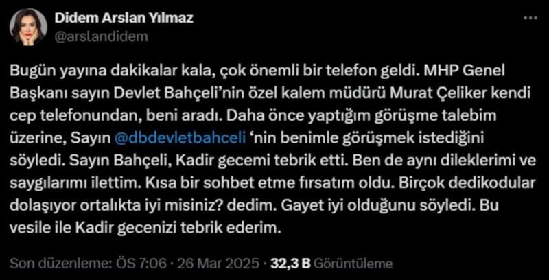 Gazeteci Didem Arslan Yılmaz, Bahçeli ile yaptığı görüşmeyi paylaşarak, MHP liderinin sağlık durumunun iyi olduğunu ve kamuoyunda dolaşan iddiaların asılsız olduğunu vurguladığını aktardı: