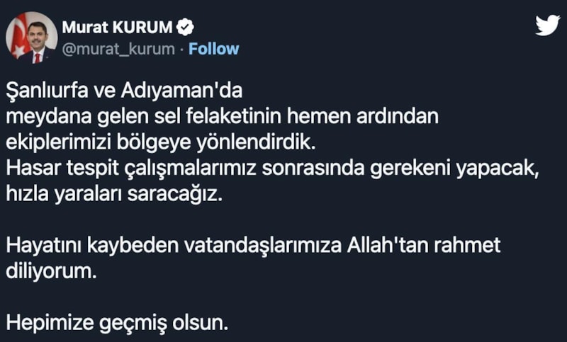 Çevre, Şehircilik ve İklim Değişikliği Bakanı Murat Kurum, Şanlıurfa'da 12, Adıyaman'da 2 kişinin yaşamını yitirdiği sel felaketi sonrası, "Hasar tespit çalışmalarımız sonrasında gerekeni yapacak, hızla yaraları saracağız" paylaşımında bulundu.