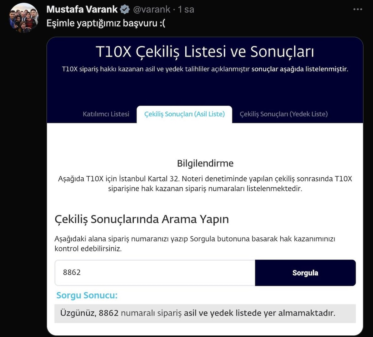 Sanayi ve Teknoloji Bakanı Mustafa Varank, çekiliş sonrasında sosyal medya hesabından bir paylaşım yaparak eşiyle yaptıkları başvurunun olumsuz sonuçlandığını açıkladı.