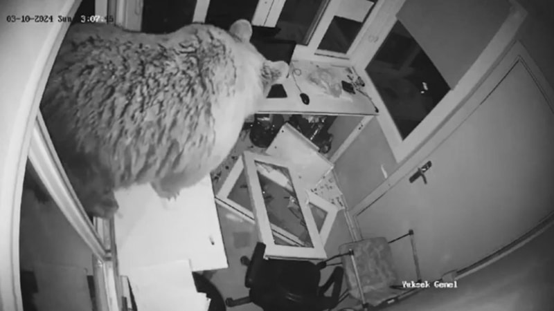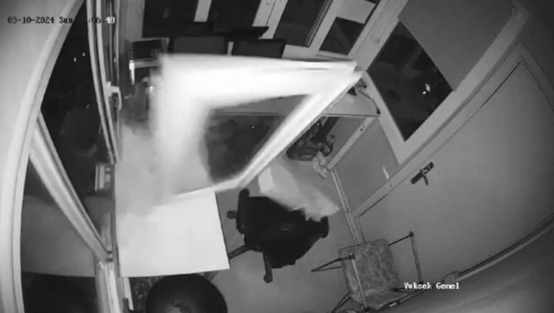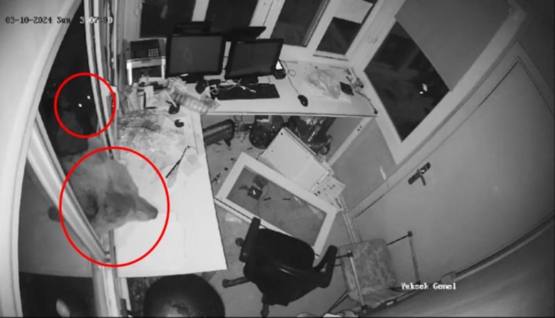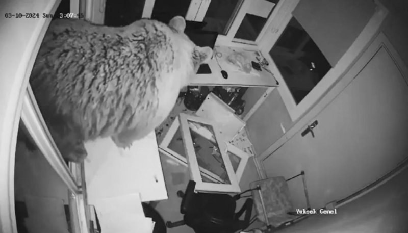 Görevlinin olmadığı kulübenin pencerelerini iteleyerek kıran ayının içeri girdiği anlar, güvenlik kamerasına yansıdı.
