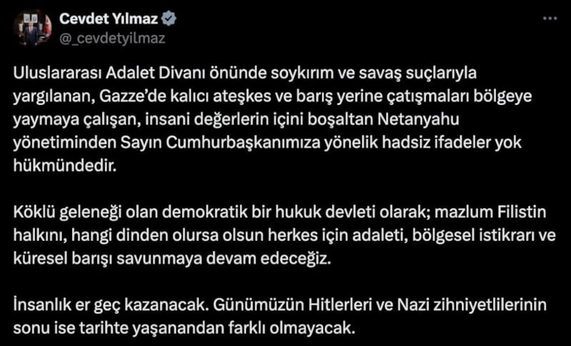 Uluslararası Adalet Divanı önünde soykırım ve savaş suçlarıyla yargılanan, Gazze'de kalıcı ateşkes ve barış yerine çatışmaları bölgeye yaymaya çalışan, insani değerlerin içini boşaltan Netanyahu yönetiminden Sayın Cumhurbaşkanımıza yönelik hadsiz ifadeler yok hükmündedir. Köklü geleneği olan demokratik bir hukuk devleti olarak; mazlum Filistin halkını, hangi dinden olursa olsun herkes için adaleti, bölgesel istikrarı ve küresel barışı savunmaya devam edeceğiz. İnsanlık er geç kazanacak. Günümüzün Hitlerleri ve Nazi zihniyetlilerinin sonu ise tarihte yaşanandan farklı olmayacak.