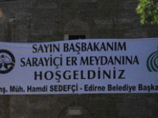Edirne Belediye Başkanı Hamdi Sedefçi'nin Sarayiçi'ne "Sayın Başbakanımız Recep Tayyip Erdoğan Edirne'mize Hoşgeldiniz","Sayın Başbakanım Sarayiçi Er Meydanına Hoygeldiniz", "Sayın Başbakanımız Kırkpınarımıza Onur Verdiniz" afişleri astırdığı gözlendi. (AHT)