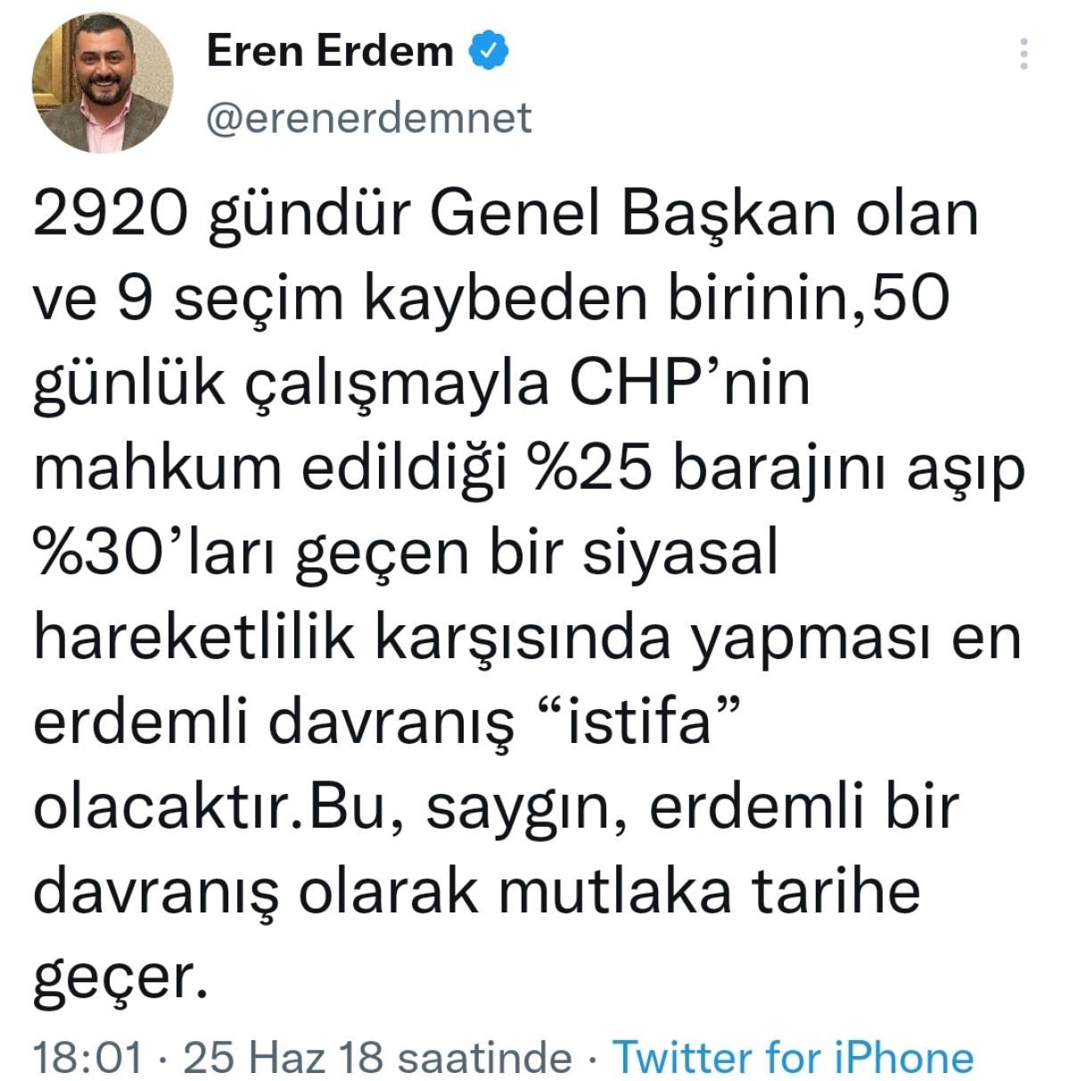 Başarısızılık durumunda istifa seçeneğini sık sık paylaşımları ile dile getiren CHP'li Eren Erdem'in, parti MYK'sına girdikten sonra seçimde büyük bir mağlubiyet yaşayan Kılıçdaroğlu'na destek açıklamaları uzun süre sosyal medyada gündem oldu.