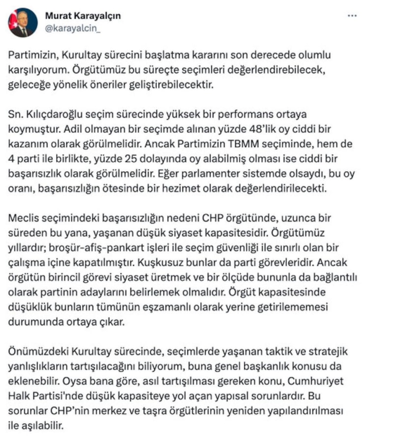 "Sayın Kılıçdaroğlu seçim sürecinde yüksek bir performans ortaya koymuştur. Adil olmayan bir seçimde alınan yüzde 48’lik oy ciddi bir kazanım olarak görülmelidir. Ancak partimizin TBMM seçiminde, hem de