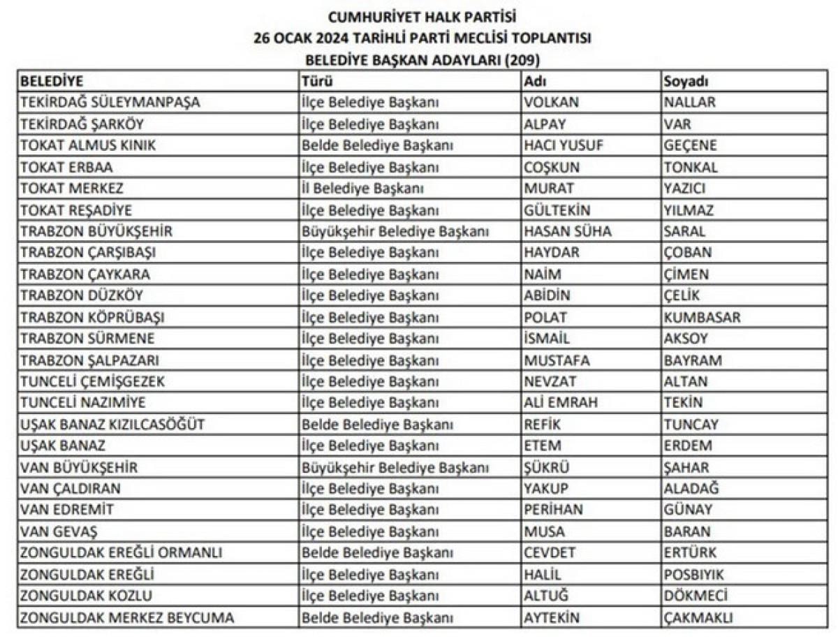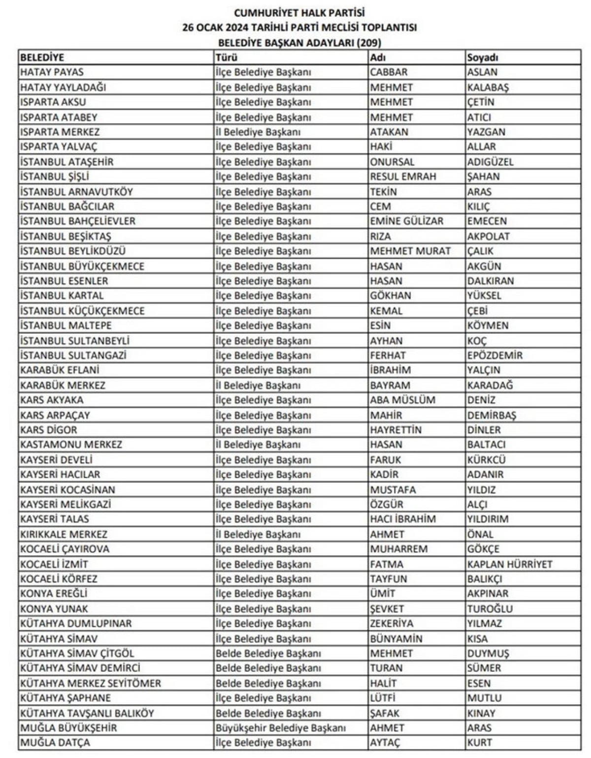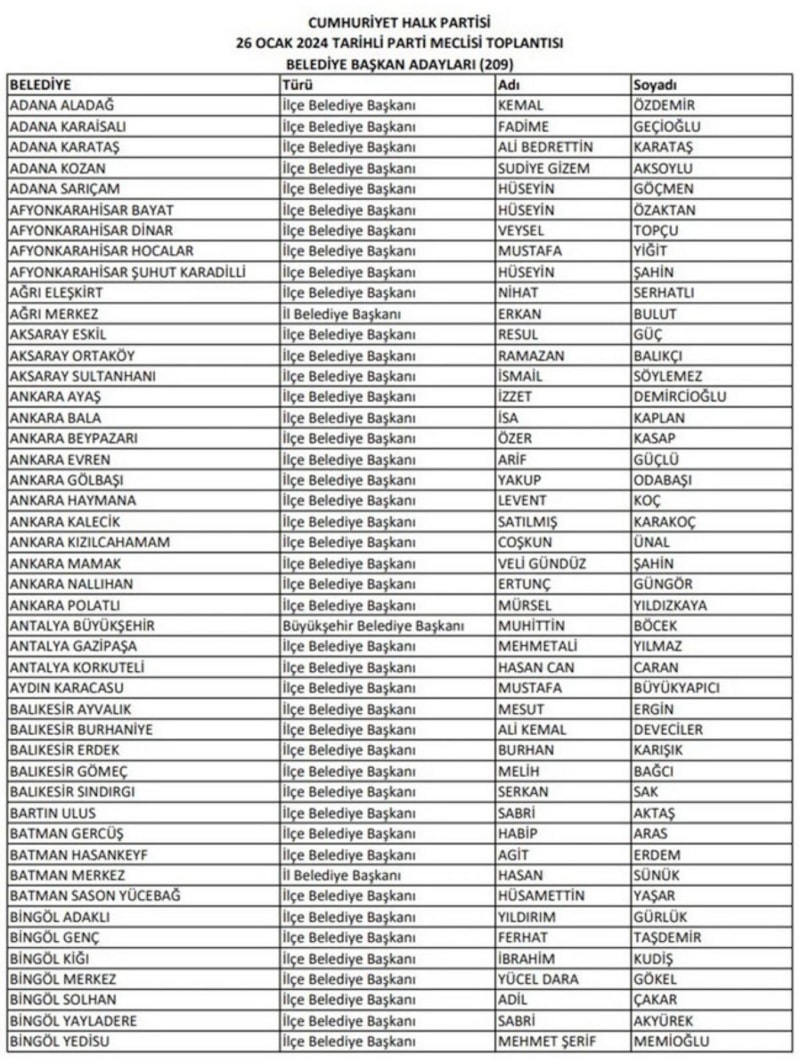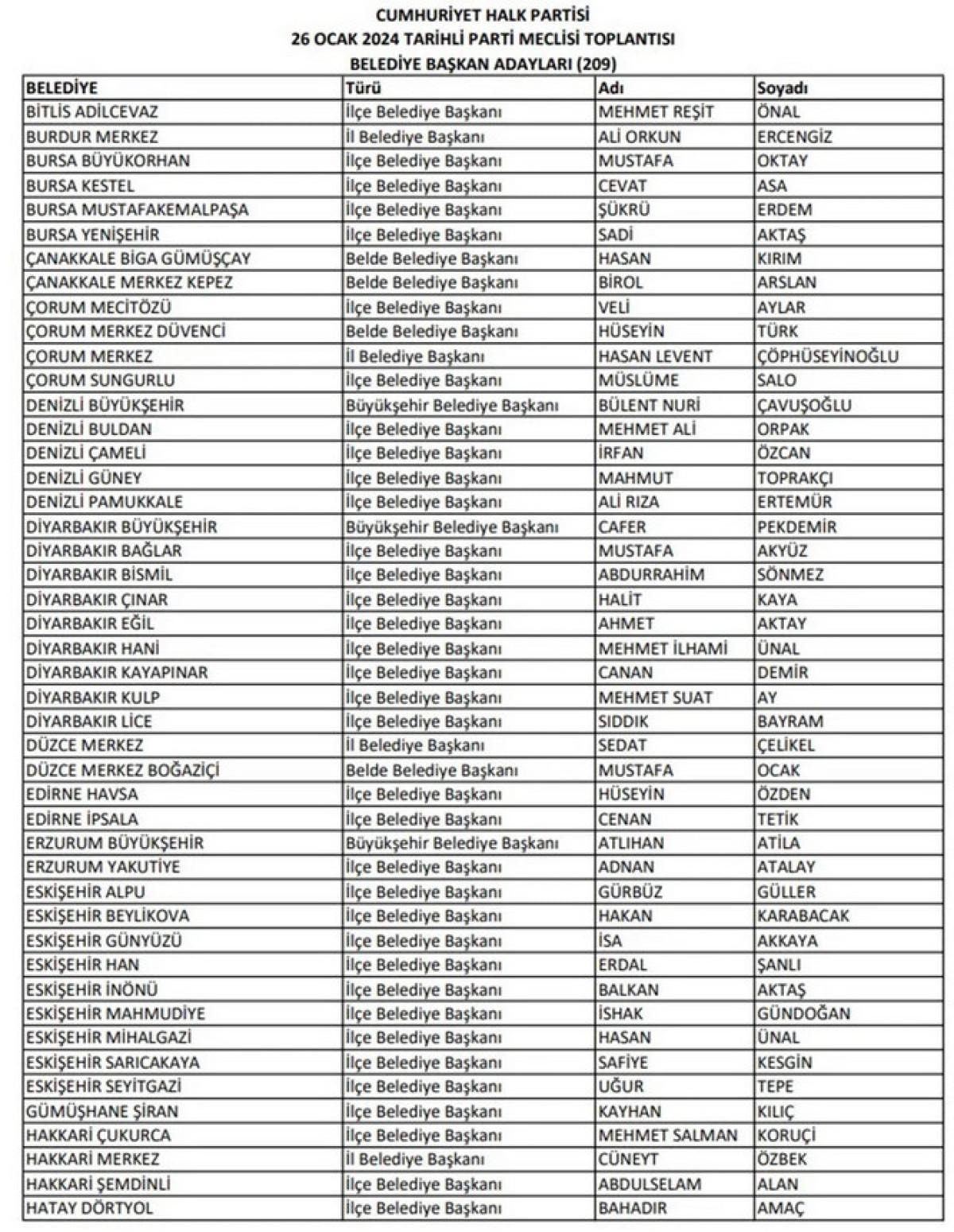 CHP'nin duyurduğu aday listesinin tamamı şu şekilde: