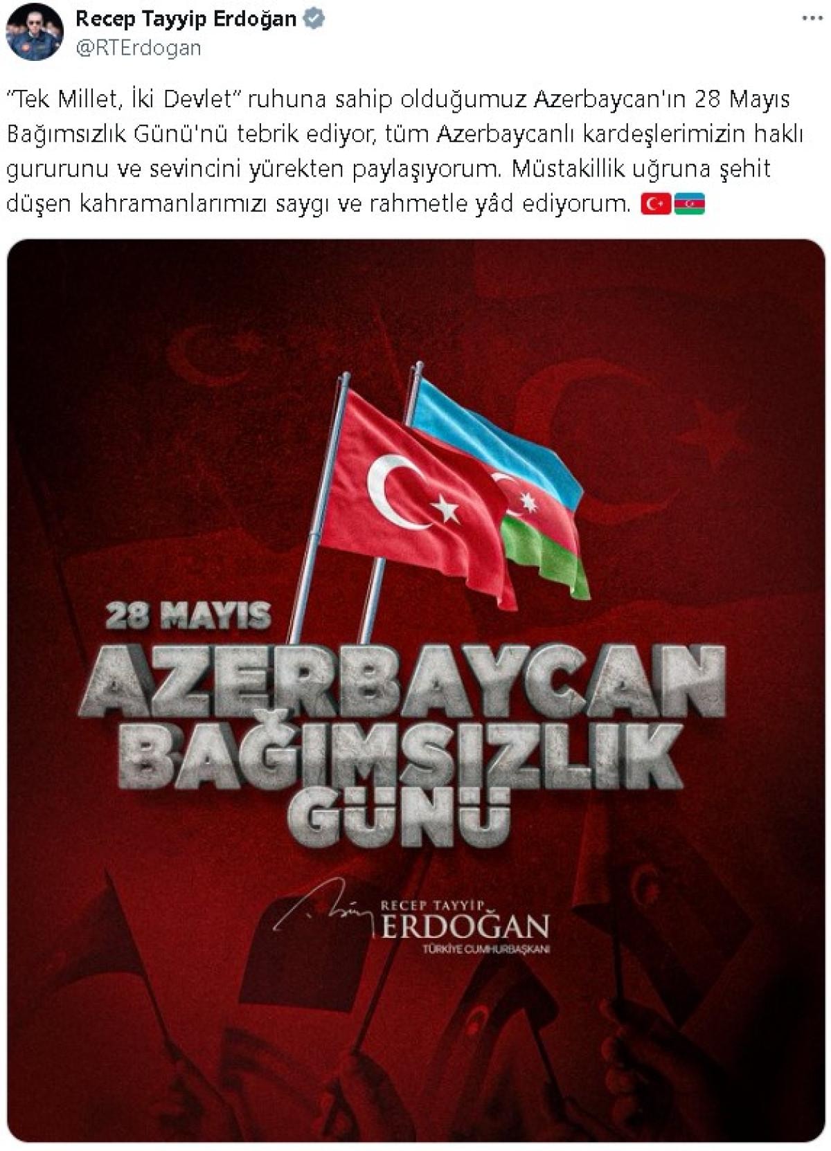 Azerbaycan'ın Bağımsızlık Günü dolayısıyla sosyal medya hesabından paylaşımda bulunan Cumhurbaşkanı Recep Tayyip Erdoğan, şu ifadelere yer verdi: