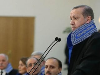 Akyel'in takdimiyle "Sayıştay cübbesi" giyen Cumhurbaşkanı Erdoğan, açılış konuşmasını yapan Recai Akyel'in ardından, Genel Kurula hitap etti.