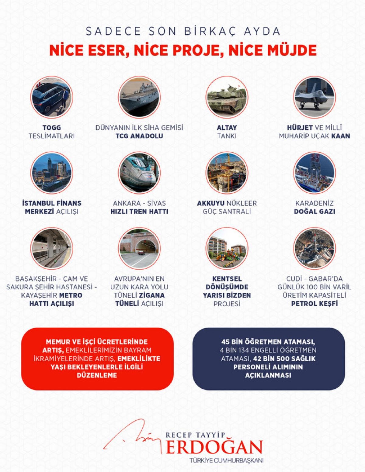 Cumhurbaşkanı Erdoğan, "Sadece son birkaç ayda nice eser, nice proje, nice müjde" başlığı ile bir de görsel paylaştı.