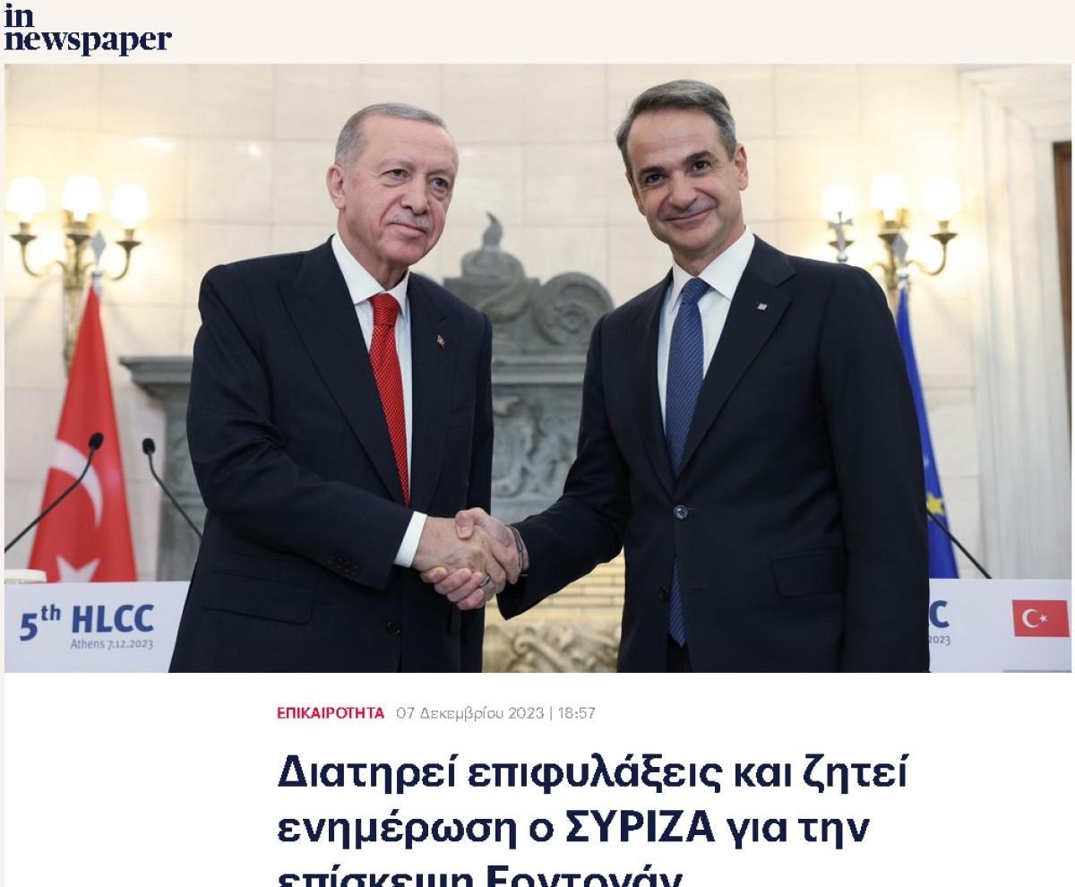 Ülkenin en çok okunan haber portallarından "in.gr" ziyarete ilişkin yaptığı özel haberde "Miçotakis ve Erdoğan'dan birlik mesajları" başlığını kullandı.