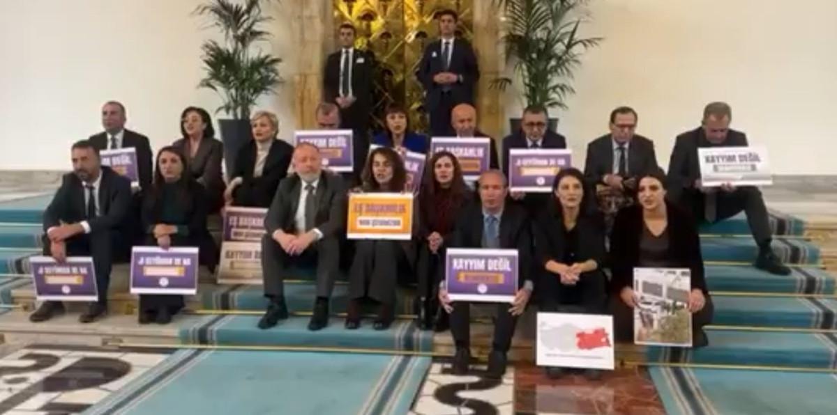 DEM Parti milletvekilleri, İçişleri Bakanlığı tarafından "terörle bağlantı ve terör örgütlerine destek" suçlamasıyla görevden alınan belediye başkanlarının yerine kayyum atanmasını protesto etmek amacıyla TBMM’de bir oturma eylemi gerçekleştirdi.