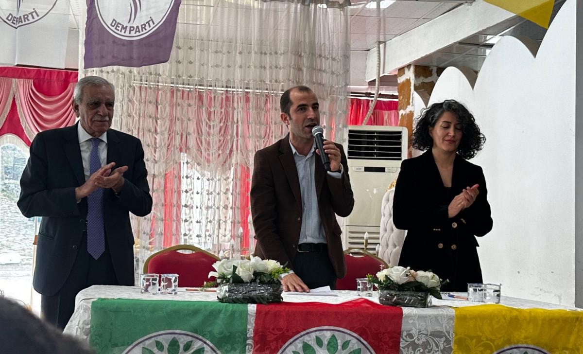 DEM Parti’nin kentte özel bir tesiste genel merkez yöneticileri, il ve ilçe örgütlerinin katılımıyla düzenlediği aday tanıtım toplantısında Ahmet Türk’ün adaylığı açıklanırken, şarkıcı Devrim Demir de eş başkan adayı olarak tanıtıldı.