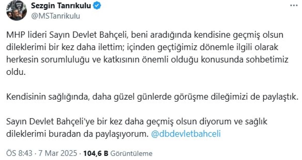 Tanrıkulu, sosyal medya hesabından yaptığı paylaşımda Bahçeli'nin kendisiyle görüştüğünü duyurdu. Bahçeli'yi etiketleyerek açıklama yapan Tanrıkulu, görüşmeye ilişkin detayları kamuoyuyla paylaştı: